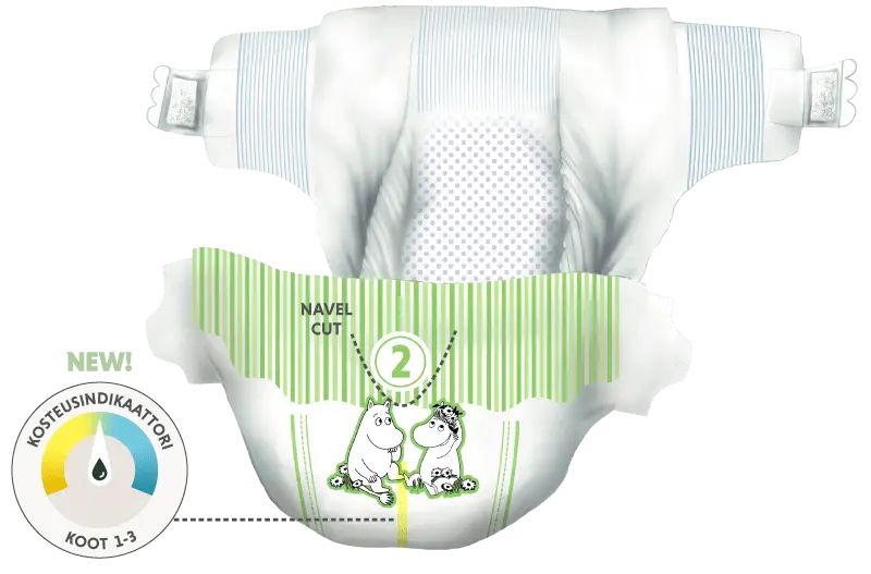 Plenky Muumi Baby Newborn ve velikostech 1 a 2 mají speciální design kolem pupku. Díky tomu je plena šetrná k citlivému pupíku novorozenců.