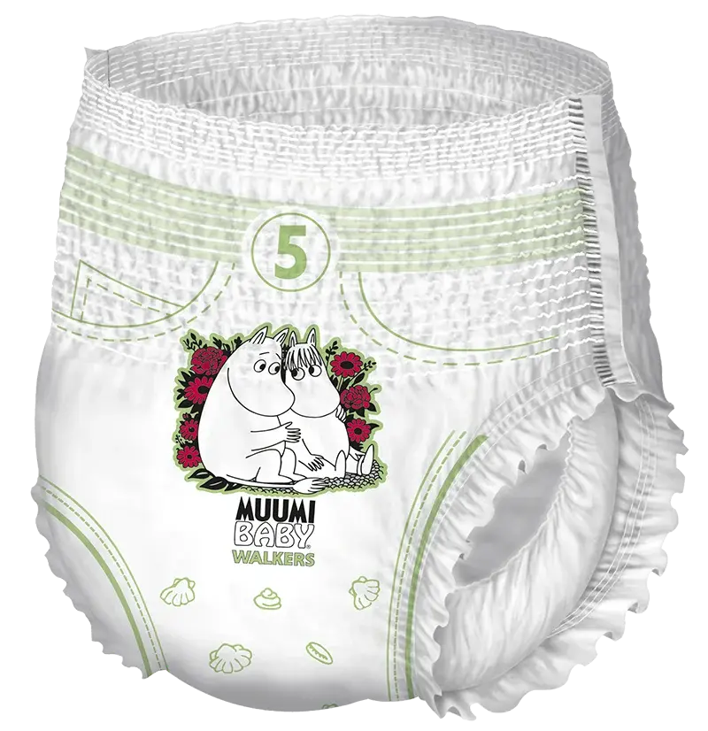 Extrémně pružné a savé kalhotkové pleny Muumi Baby jsou navrženy pro aktivní děti, které se již učí chodit a je pro ně obtížné sedět klidně i během přebalování.