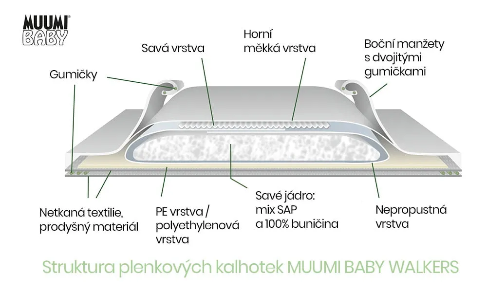 Plenkové kalhotky Muumi Baby Walkers jsou určeny pro aktivní děti, které se již učí chodit. Plenkové kalhotky se snadno natahují a stejně snadno se sundávají rozepnutím stran plenky. Plenkové kalhotky jsou vhodné pro denní i noční použití a jako nočníky na trénink.